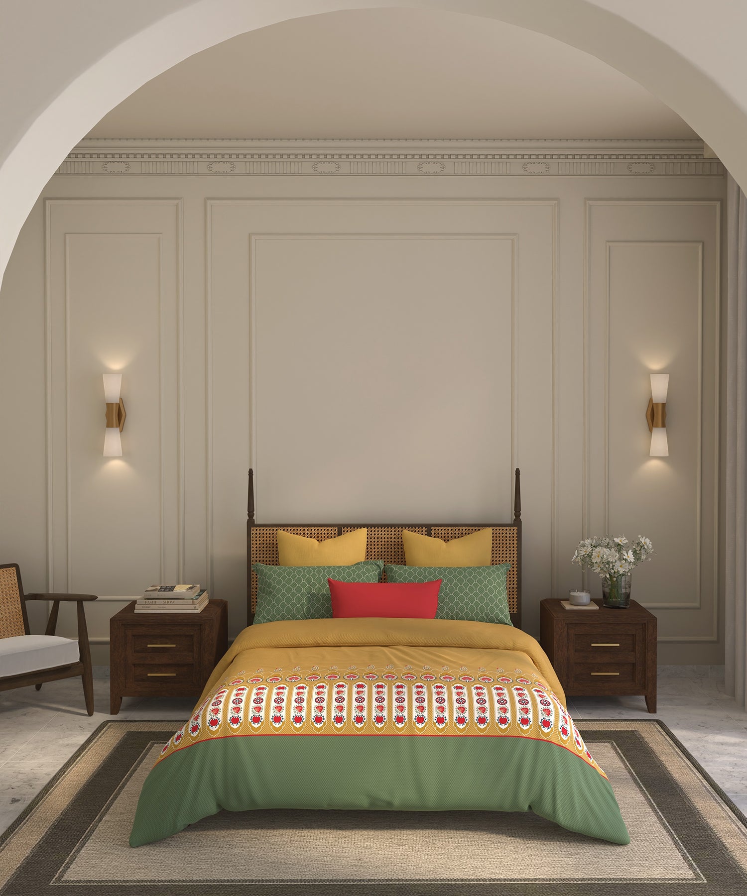 A celebration of heritage in every thread: Inspired by the timeless beauty of Suzani art, this bedsheet set brings the soul of tradition into your modern home. The swirling florals and bold motifs echo generations of craftsmanship, adding a rich cultural charm to your bedroom.