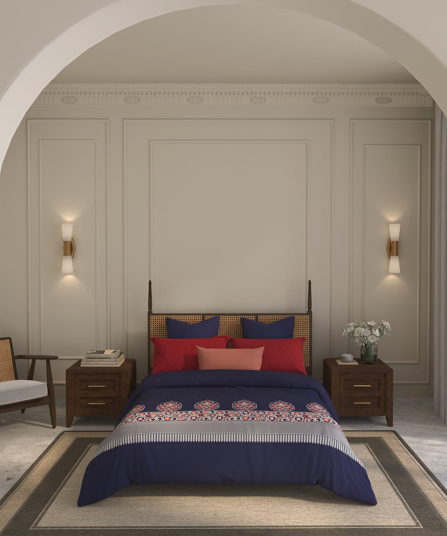 A celebration of heritage in every thread: Inspired by the timeless beauty of Suzani art, this bedsheet set brings the soul of tradition into your modern home. The swirling florals and bold motifs echo generations of craftsmanship, adding a rich cultural charm to your bedroom.