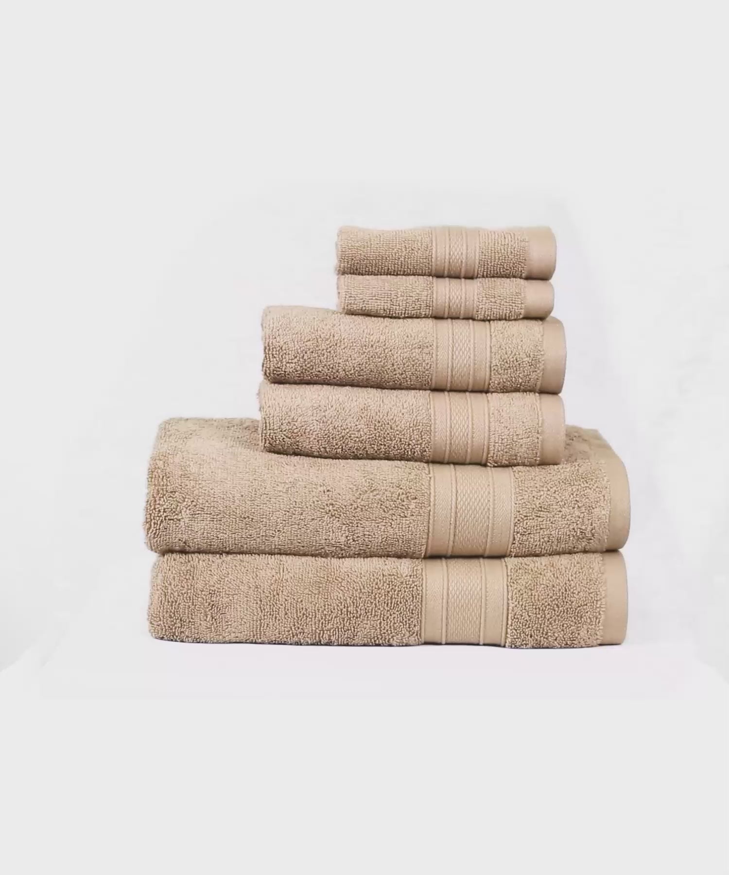 - 6 Pieces Towel Set - This set includes 2 Bath Towel (137 cms x 69 cms), 2 Hand Towel (66 cms x 41 cms), and 2 Face Towel (30 cms x 30 cms).